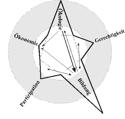 Um kein Mißverständnis aufkommen zu lassen: Wenn hier die gesellschaftliche und die politische Ebene aus den genannten Gründen einer differenzierten, analytischen Einschätzung betont wird, dann bedeutet dies in der Konsequenz nicht, (Umwelt)Pädagogik instrumentell auf eine gesellschaftliche bzw. politische Funktion im Prozeß der Modernisierung verkürzen zu wollen (vgl. 5.3). Im Gegenteil wird die im politischen Raum und im Nachhaltigkeitsdiskurs eindeutig vorherrschende instrumentelle Sichtweise der Umweltbildung und der Bildung für eine nachhaltige Entwicklung kritisch beurteilt. Deshalb wird sowohl dem Partizipationsgedanken als auch der Bildung eine eigenständige Rolle und damit ein größeres Gewicht im Verständnis einer nachhaltigen Entwicklung zugemessen (s. „Stern der Nachhaltigkeit“ in 3.3.2). Unterstützt wird diese bildungstheoretisch begründbare Position[4] durch die bisher wenig beachteten internationalen und weltweiten Bemühungen der UNESCO um eine neue Bildung (s. 3.3.1).